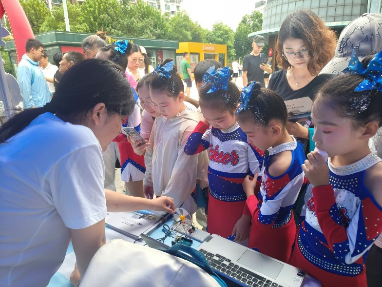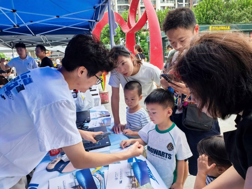 9月6日上午,武汉光电国家研究中心科普团队来到维佳·佰港城广场,参与科普展示及体验分会场活动。武汉光电国家研究中心展示的科普实验吸引了大批观众,不少人手持设备记录活动过程,现场氛围热烈。展示活动中,第七届“创意光电”科普大赛获奖者高子雷、吴易同学以硬纸板制作的朴素调制盘为核心道具,结合Arduino程序驱动的小马达,向现场观众直观呈现科学原理。展示过程中,两人先调试设备确保小马达正常运转,待马达带动调制盘旋转后,详细讲解了调制原理与调制盘的空间滤波作用,深入浅出地阐述了复杂的光电知识,帮助观众更好地理解光的传播变化及信号筛选原理。